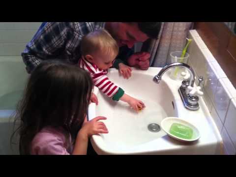 Eloise is exploring some bath time fun with her daddy and big sister.